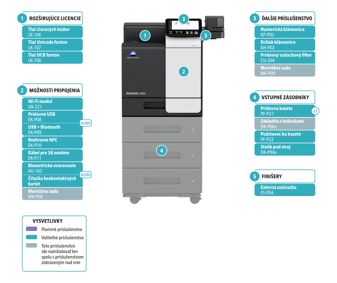 AirPrint (iOS); Mopria (Android); Konica Minolta Mobile Print (iOS, Android); Wi-Fi Direct (voliteľne) |
